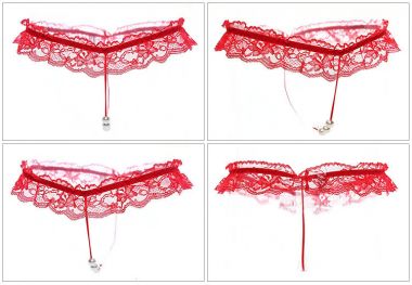 (情趣内衣)激情蕾丝开裆T裤女性低腰透明内裤蕾丝按摩开档性感丁字裤(红色)